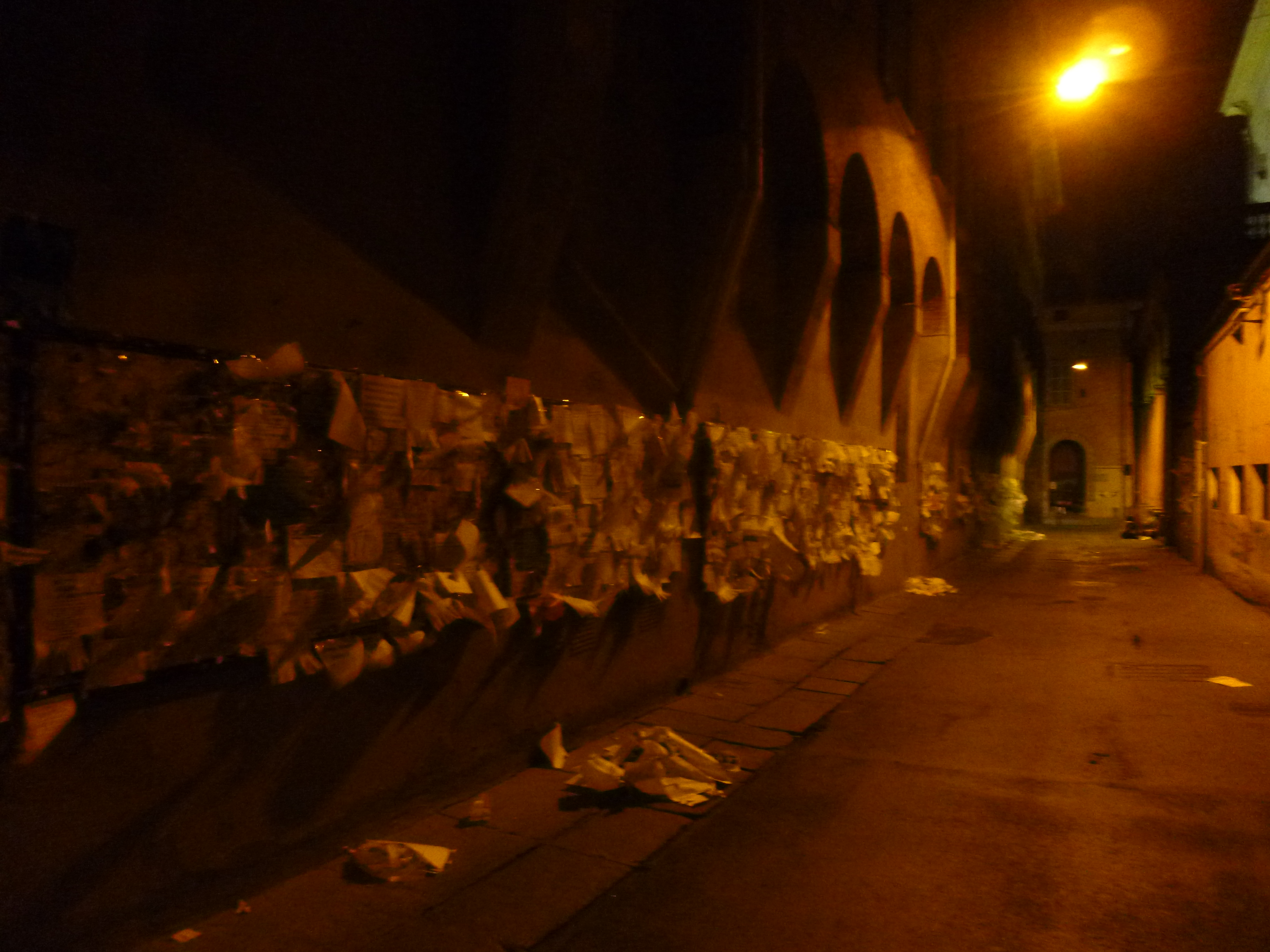 My first view of Bologna was on a night tour with Davide. The city is full of students and so we walked through the streets and I caught a glimpse of how lively the place is when it’s dark. The students fill the bars and cafes, and sit on the streets and play guitar and sing. It was really fantastic, and made me wish that my university experience had been filled with the same zeal. On one street there were bill boards on the walls completely filled with white paper. These ads contained information about apartments for rent in the city. The students flock here at the beginning of the day to try and find somewhere to stay for the year, and a lot of the time will pay any price.