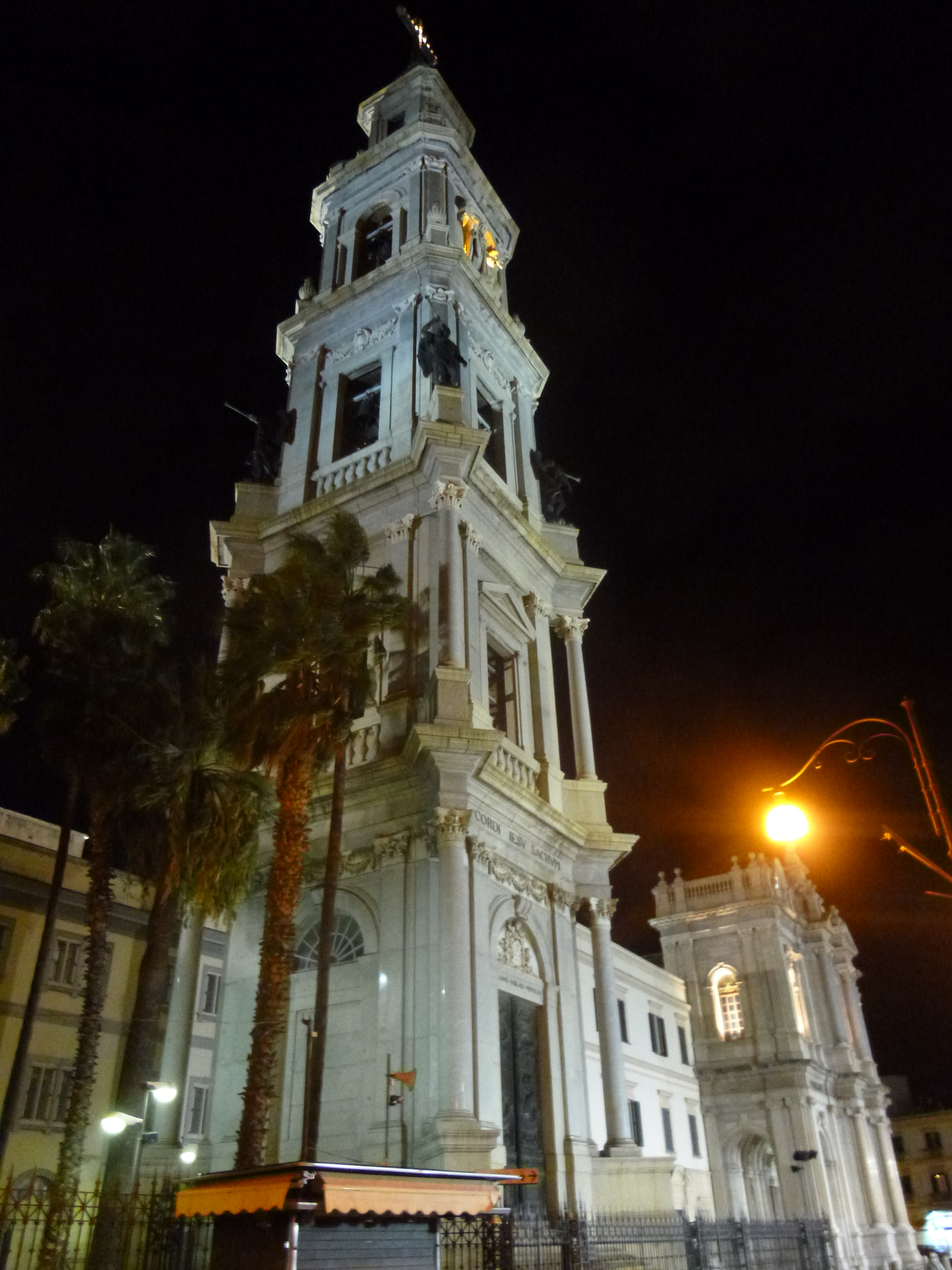 I woke up the next morning and went out to find a bookstore that might sell some books in English. I needed something good to read and reading is so much more relaxing when you are sitting by the water. After reading the entire book Fifty Shades of Grey in the store, I picked up the book Never Let Me Go. I totally loved it and left it behind in Sevilla for another couchsurfer to enjoy as much as I did. With my book, I headed down to the promenade on the water to read and catch some rays. I was totally relaxed. I met Loborio, another couchsurfer, for lunch and we went to a pizzeria in the centre. I decided to try the pizza topped with mozzarella made with buffalo milk, which is a specialty from this region of Italy. Well it was AMAZING. Mozzarella in Canada just isn’t the same thing at all. Actually I will probably never eat it in Canada again to be honest. On my way back to the hostel I ran into the waiter that tried to help me with directions the day before. He treated me to some coffee on the house and proceeded to try to have a conversation with me mostly in Italian. I think it was the most difficult conversation I have ever had in my life! That night I went with Alfonso to Pompei to see it at night and the beautiful church. The place is picturesque and very small. And I couldn’t help but wonder why they would rebuild a city in the same place where the other one was destroyed by a volcanic eruption. Humans work in mysterious ways.