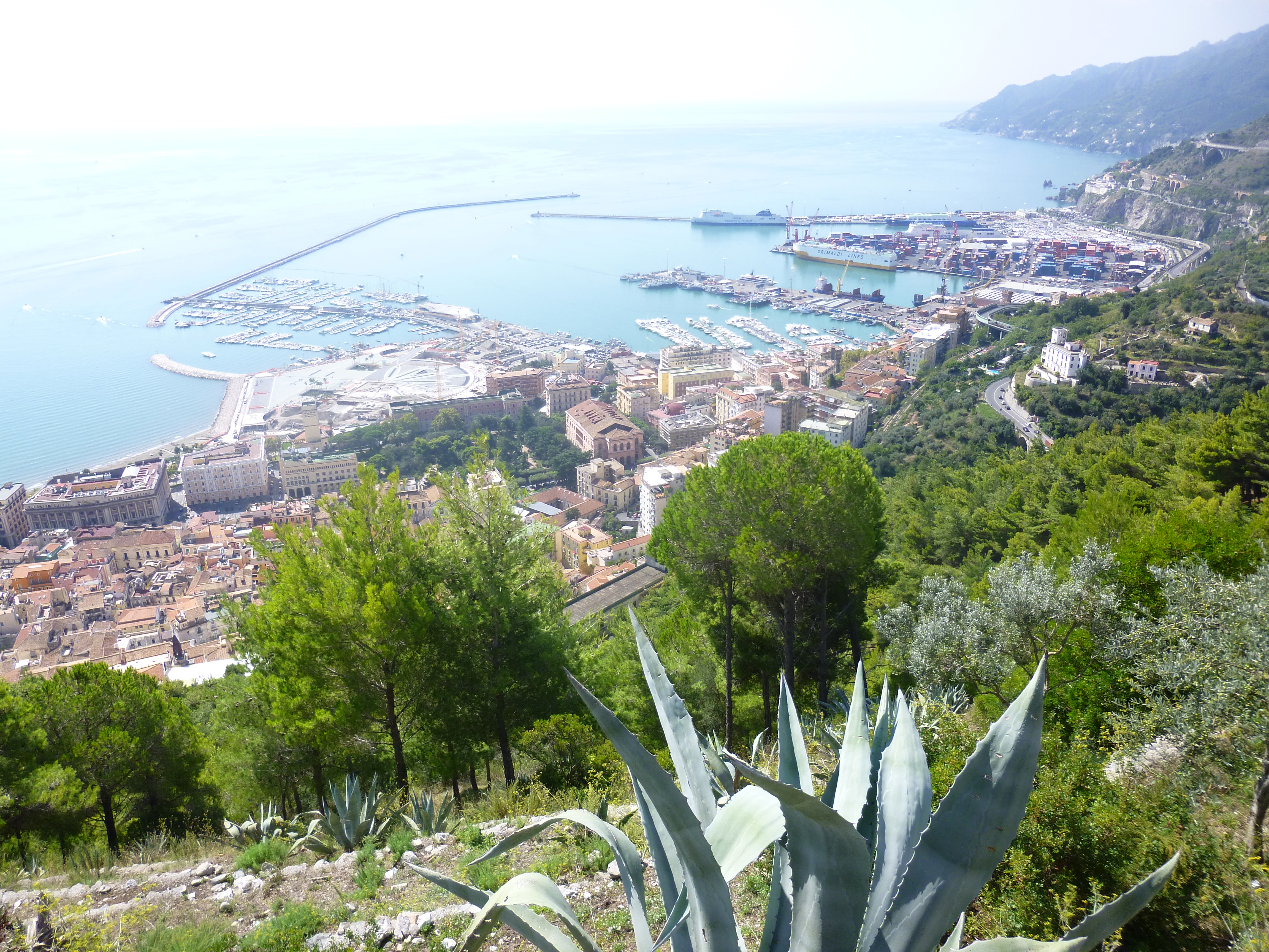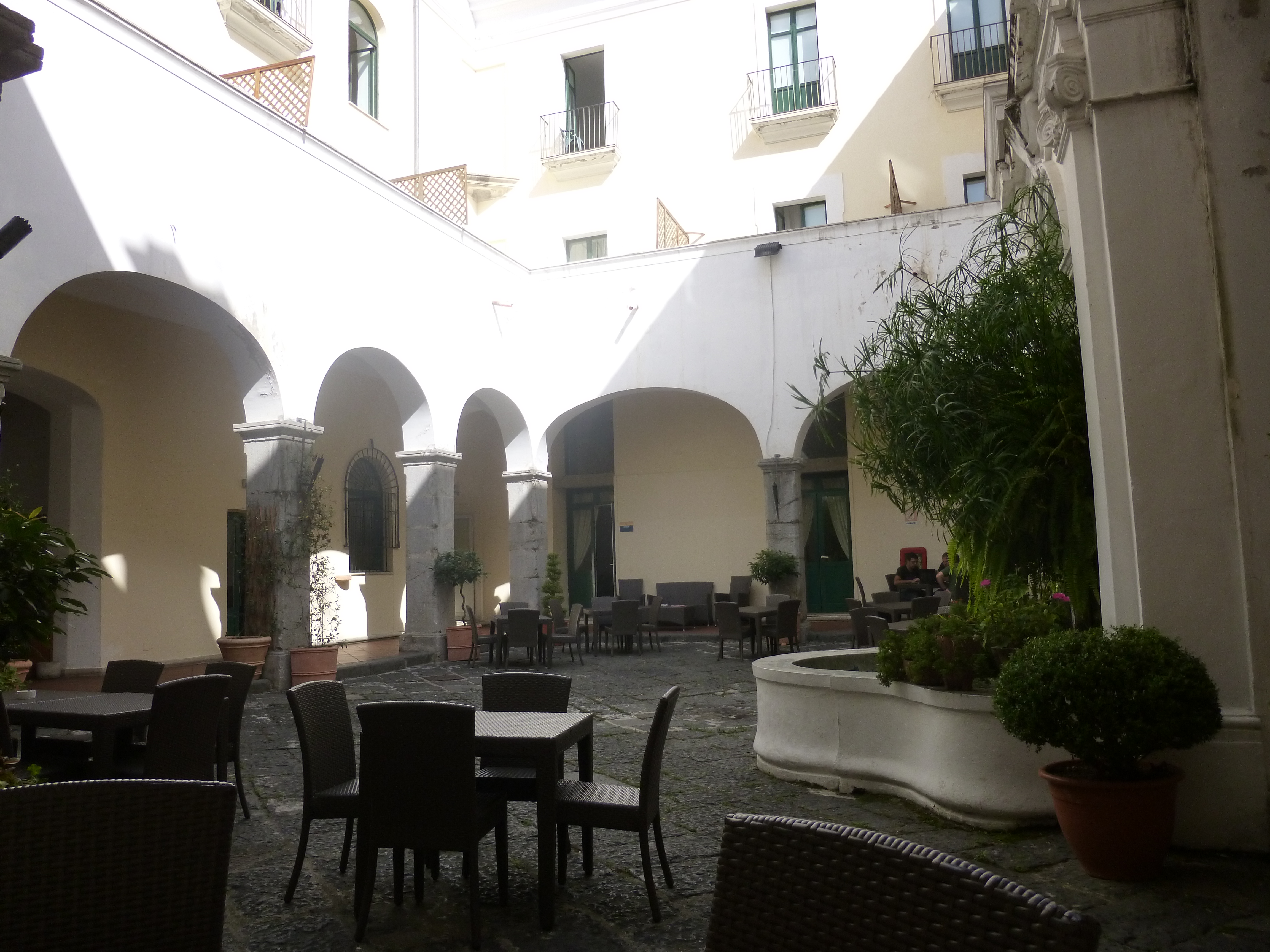 This entry will be a bit shorter than some of my others. I came to Salerno to relax a bit with the smell of the Mediterranean and the sun kissing my skin. I arrived by train from Rome and ended up getting a little lost, as usual, trying to find my hostel. I asked a young guy working at a cafe where I could find the street I was looking for and he tried so hard to help me in English, but in the end I had to get help from someone else. I really appreciated the effort from the Italians to communicate with me in English though. So I found my way to my hostel, Ave Gratia Plena, in Salerno. Really great location and the place was beautiful. The hostel was in an old convent sort of thing, with a beautiful patio and fountain on the ground floor. The staff were great and the room was clean and quiet. I even had a lovely view from my room of the cobble stone road below leading to the main road and ocean beyond that.