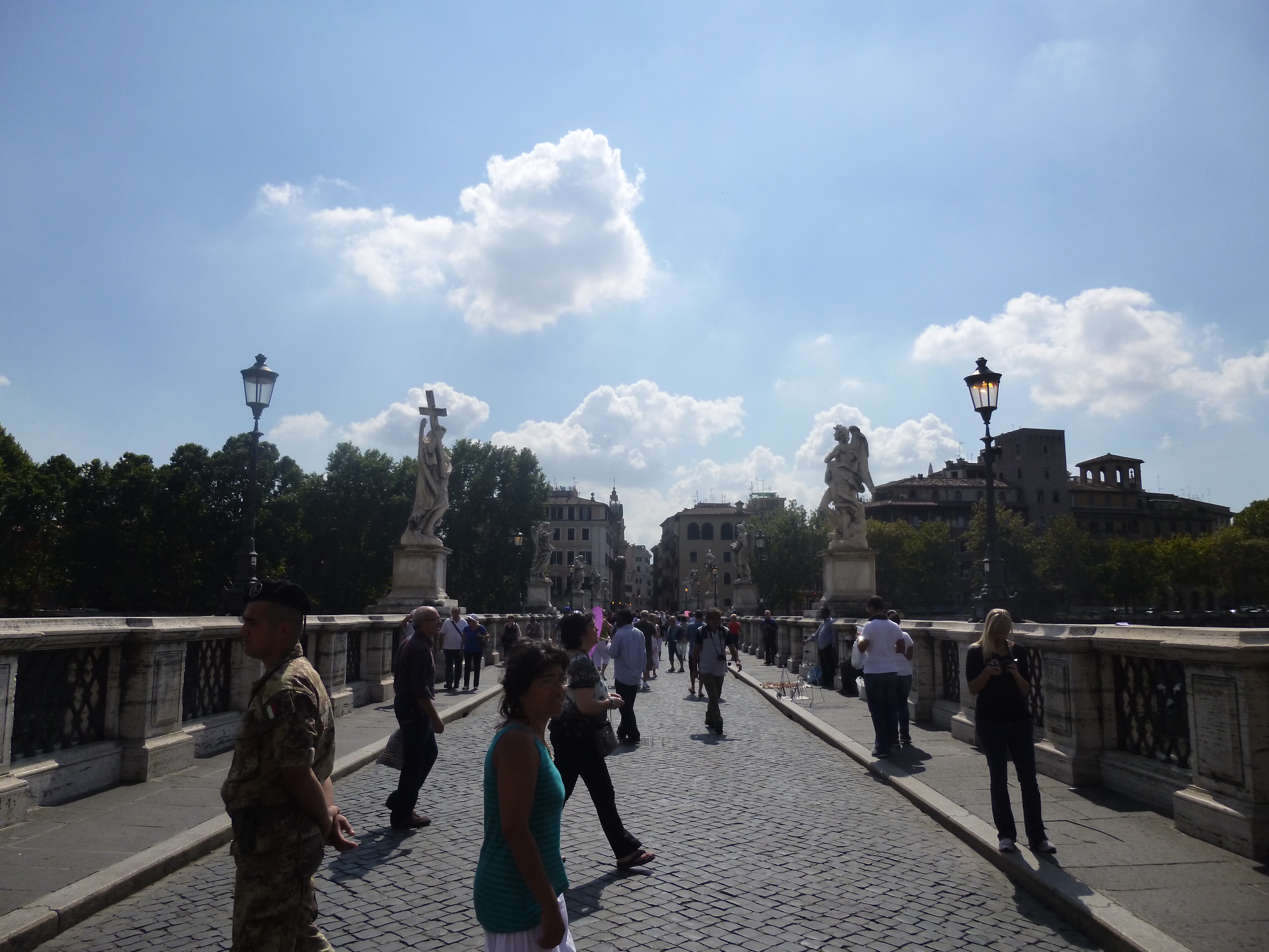 The next day in Rome was to be spent seeing some of the places I hadn’t yet been to. My first stop was in Vatican City. I arrived there by bus and had to walk along the Vatican wall to get to the entrance to the city. So opinions are very personal obviously, and I have to say that I wasn’t very impressed by the Vatican. I can’t tell you why. Maybe it was the sheer amount of people, or perhaps it is overrated. I wish I knew. So I quickly left and walked east toward the castle of San Angelo. The grounds are beautiful; the castle sits in the centre with a two tiered park around the structure. The castle is connected to the other side of the Tevere river by the Ponte San Angelo, which is flanked by gorgeous statues along its entire length. I then walked up along the river and then to the east to Piazza di Spagna and the Spanish Steps. The climb isn’t horrible and the view is beautiful. The Villa Borghese is just behind this place and the surrounding area is very ritzy, with lots of boutiques and fancy restaurants. I then continued my walk back to Piazza Venezia in the centre.